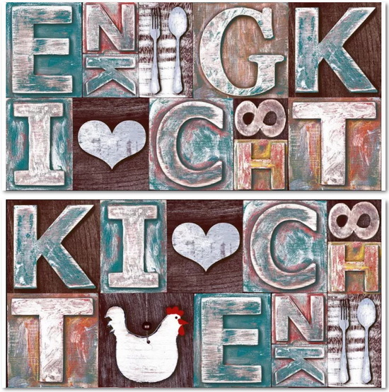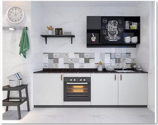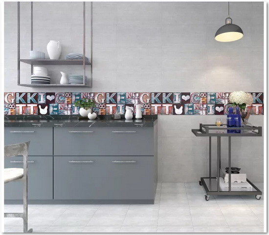 同樣是廚房,淺灰色調的瓷磚讓空間更具低調沉穩(wěn)的視覺美感。色調繽紛的英文字母與廚房用品圖案相間,演繹著“鍋碗瓢盆”的樂章,個性十足讓整個空間妙筆生花。