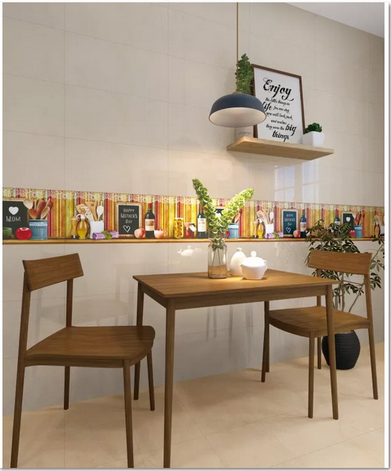廚房空間多用單調平鋪的瓷磚,以保持整潔明凈。調皮的水果圖案花片,為廚房增加跳躍的成份,干凈不俗套。
