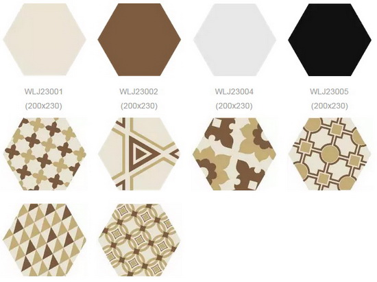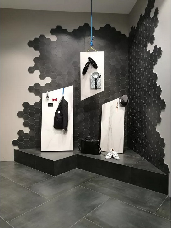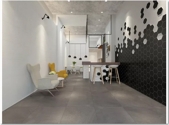 黑白灰三色大行其道的空間,當然少不了搭配的花片。顏色和紋理圖案更為多變的六角磚,點綴于瓷磚之間,帶來更強的視覺沖擊力,與多種家居風格完美融合。