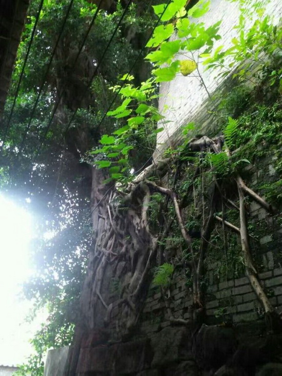 從古窯映像對面的房子穿過,來到了一棵古榕樹下,這就是有名的古灶神榕。這棵榕樹就在南風(fēng)古灶的窯尾頂部,離地近二十米,樹葉一直伸繞到底部,形成了一面樹根墻,在崖壁下形成了一個樹根洞穴。相傳這棵樹已有五百年歷史,人們在樹根洞穴處用水泥做了一對腳印,據(jù)說站在這里摸摸樹根,可以沾沾神樹五百年之靈氣,避邪祛病,永保平安!《古灶神榕》對古榕有精彩的描述:“參天巨榕攀壁而立,盤根錯節(jié),奇?zhèn)ズ佬郏瑪?shù)百年來,與龍窯相伴,凌寒傲暑,嘯雨吟風(fēng),上承云天雨露,下迪陶彩窯煙,近瞻盡觀清麗之姿,遠(yuǎn)眺可賞碧濤之浪,恒日月而留青史,馭風(fēng)霜以蔭陶人,古灶煌煌,譽(yù)傳天下。榕風(fēng)煦煦,永澤陶暉?!?