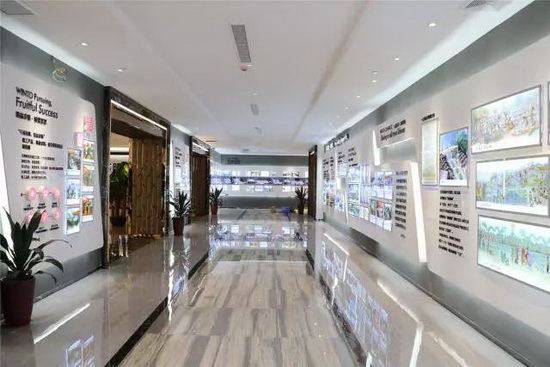 一樓展館通道各種瓷板畫組成的中式屏風、背景墻,以及產(chǎn)品形象畫的文化畫面,構(gòu)成了宏陶精工文化的中國風氛圍。美輪美奐的展館設(shè)計讓置身其間的人喜愛之意溢于言表。