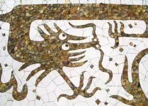 這幅龍形壁畫(huà)由近萬(wàn)塊碎陶片組成,且這些陶片來(lái)歷非凡。其中有發(fā)掘于南風(fēng)古灶附近的明清時(shí)代陶片,約一百到六百年的歷史;有發(fā)掘于張槎奇石唐宋時(shí)代的陶片,約一千年的歷史;更有部分發(fā)掘于河宕貝丘遺址的新石器時(shí)代陶片,距今已有五千年的歷史了。