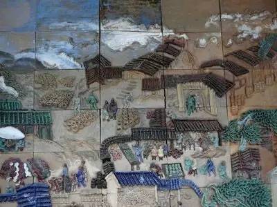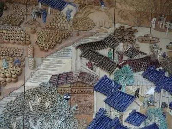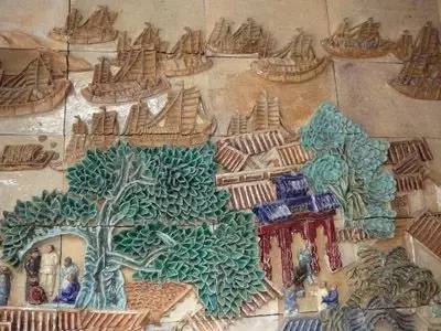 反映當(dāng)時燒制陶器的情景。古代石灣陶業(yè)在清代全盛時期有龍窯107座,分上、中、下窯區(qū)。龍窯一般依山而建,頭低尾高,窯長幾十米,形如巨龍,故稱龍窯。燒窯通常是自下而上,燒至窯尾處,火從欄尾出,烈焰熊熊,煙火沖天,從白天一直燒至晚上,此起彼伏,場景非常壯觀!