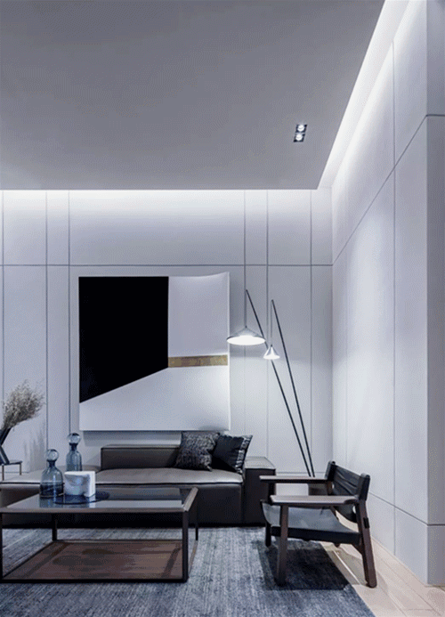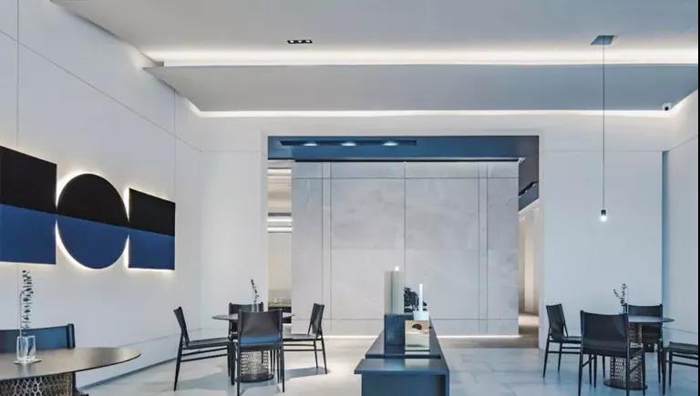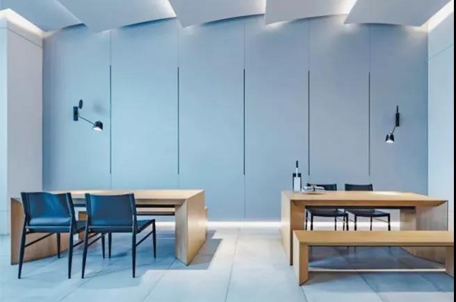 幾何感的室內(nèi)以灰白為主,在灰調(diào)的基礎(chǔ)上大膽用色,打翻了甘藍(lán)顏料桶,發(fā)揮出空間隨性。藍(lán)色是理智和安祥的象征,白色給人以清爽無瑕感。凌厲的筆法構(gòu)建空間感官錯(cuò)覺和視覺沖擊,在清新的色調(diào)中,棱角變得柔和,厚重得到分解。色彩的提煉促使氛圍尤為明晰,又掠過淡淡橘黃,暖意無疑是超脫場(chǎng)景外最充滿吸引力的。