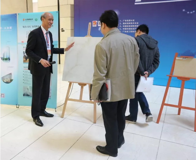 歐總為廣東電視臺記者介紹宏陶“玉瓷磚”